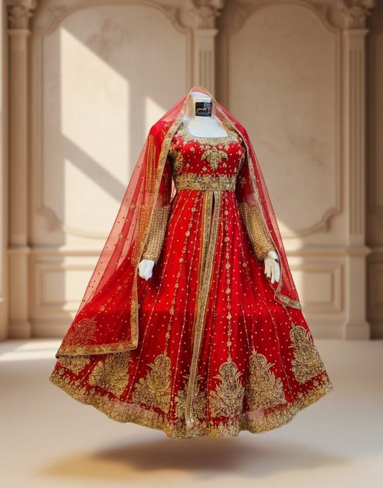 Make a grand statement with this Afghani Traditional Anarkali Frock (Pishwas), designed for women who cherish elegance, luxury, and cultural heritage. Crafted in a rich crimson red (deep red) base, the gown is lavishly adorned with heavy gold and champagne embroidery, creating a regal, opulent look perfect for celebrations.
