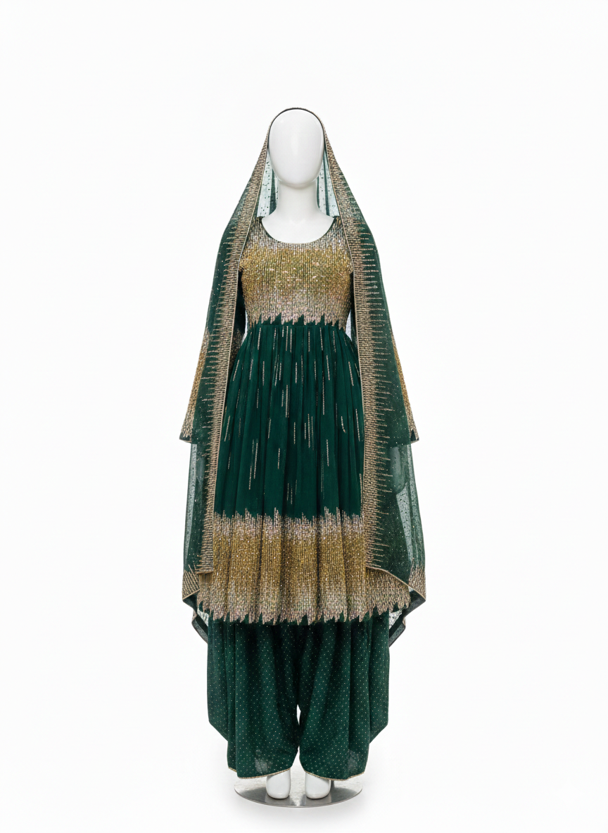 Afghani Dress Traditional Ethnic Formal Outfit – Green with Gold & Silver Embellishment