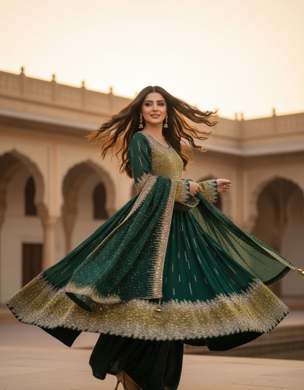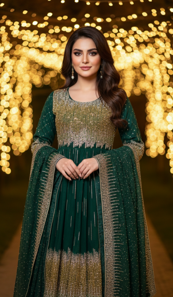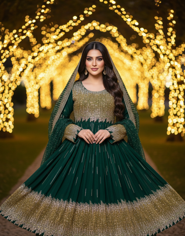 Crafted with authentic Afghan craftsmanship, the dress showcases intricate detailing and a flowing formal silhouette that enhances poise and elegance. The combination of green, gold, and silver symbolizes luxury, festivity, and cultural richness—perfect for weddings, cultural ceremonies, formal gatherings, and special celebrations.