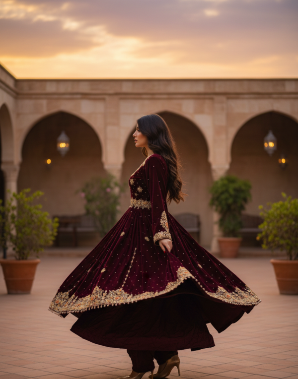 Inspired by traditional Afghan craftsmanship, the dress showcases refined detailing and a flowing formal silhouette that enhances elegance and presence. The maroon and gold color combination symbolizes royalty, celebration, and heritage—making it a perfect choice for weddings, cultural ceremonies, formal gatherings, and festive events.