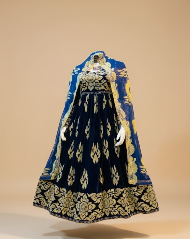 Afghani Kurdish Fistan – Royal Navy Blue with Champagne Gold Embroidery & Sheer Kawa