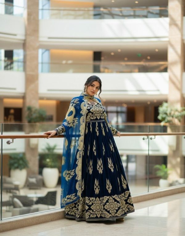 Step into royal elegance with this Afghani Kurdish Fistan, designed for women who love traditional luxury with a modern touch. The gown features a deep royal navy blue base intricately adorned with metallic champagne gold embroidery, creating a stunning, sophisticated contrast.