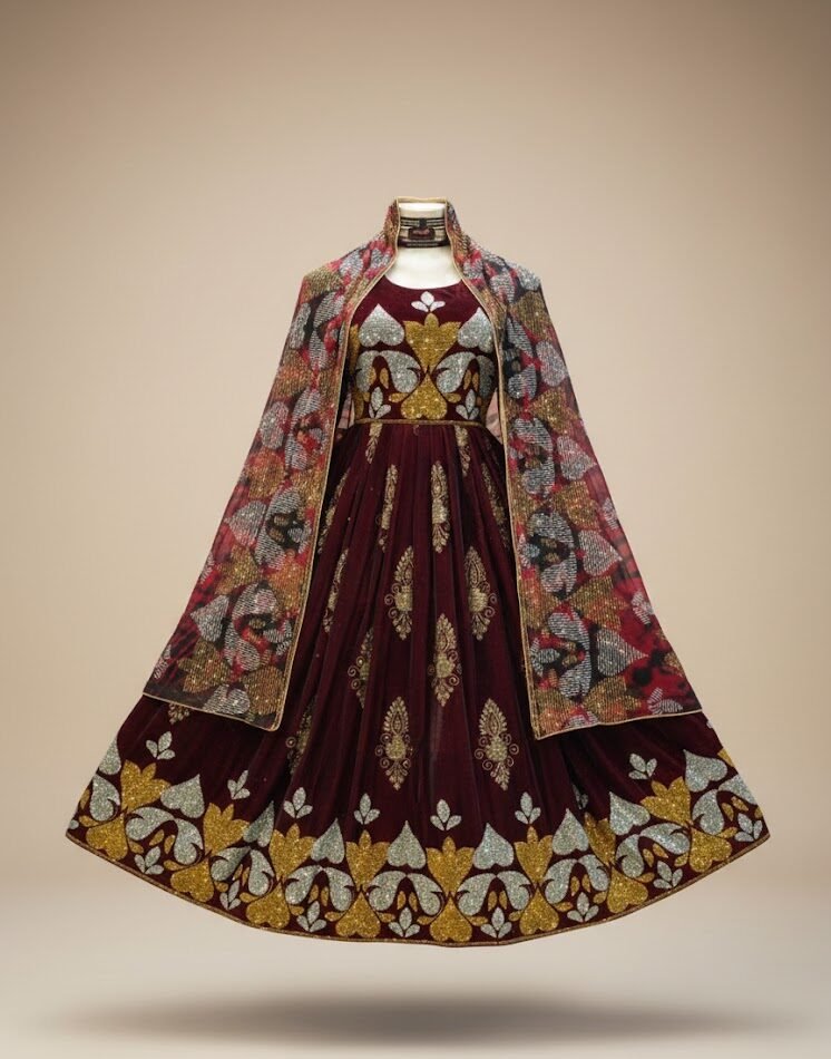 Be the first to review “Afghani Royal Floral Zari Dress – Midnight Black Traditional Gown with Draped Wing Sleeves”