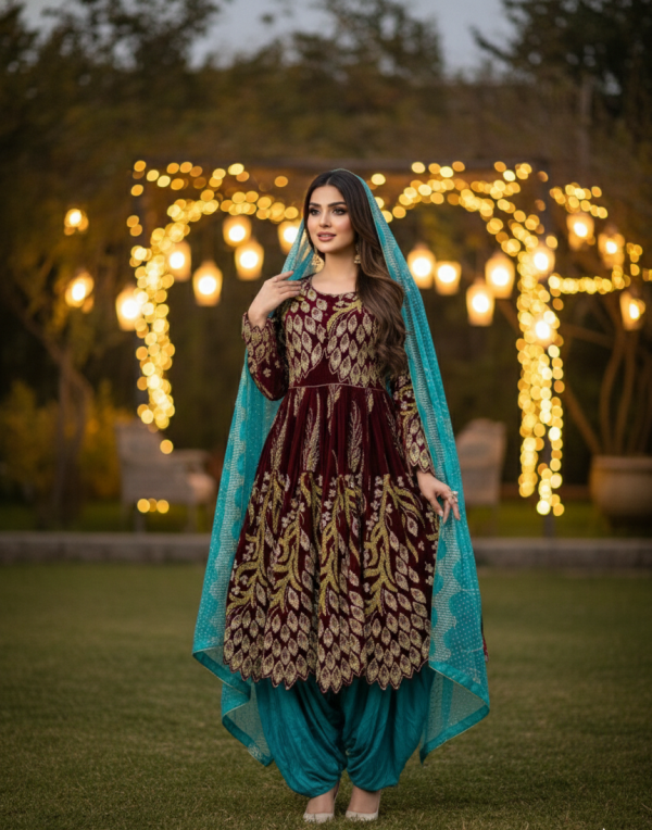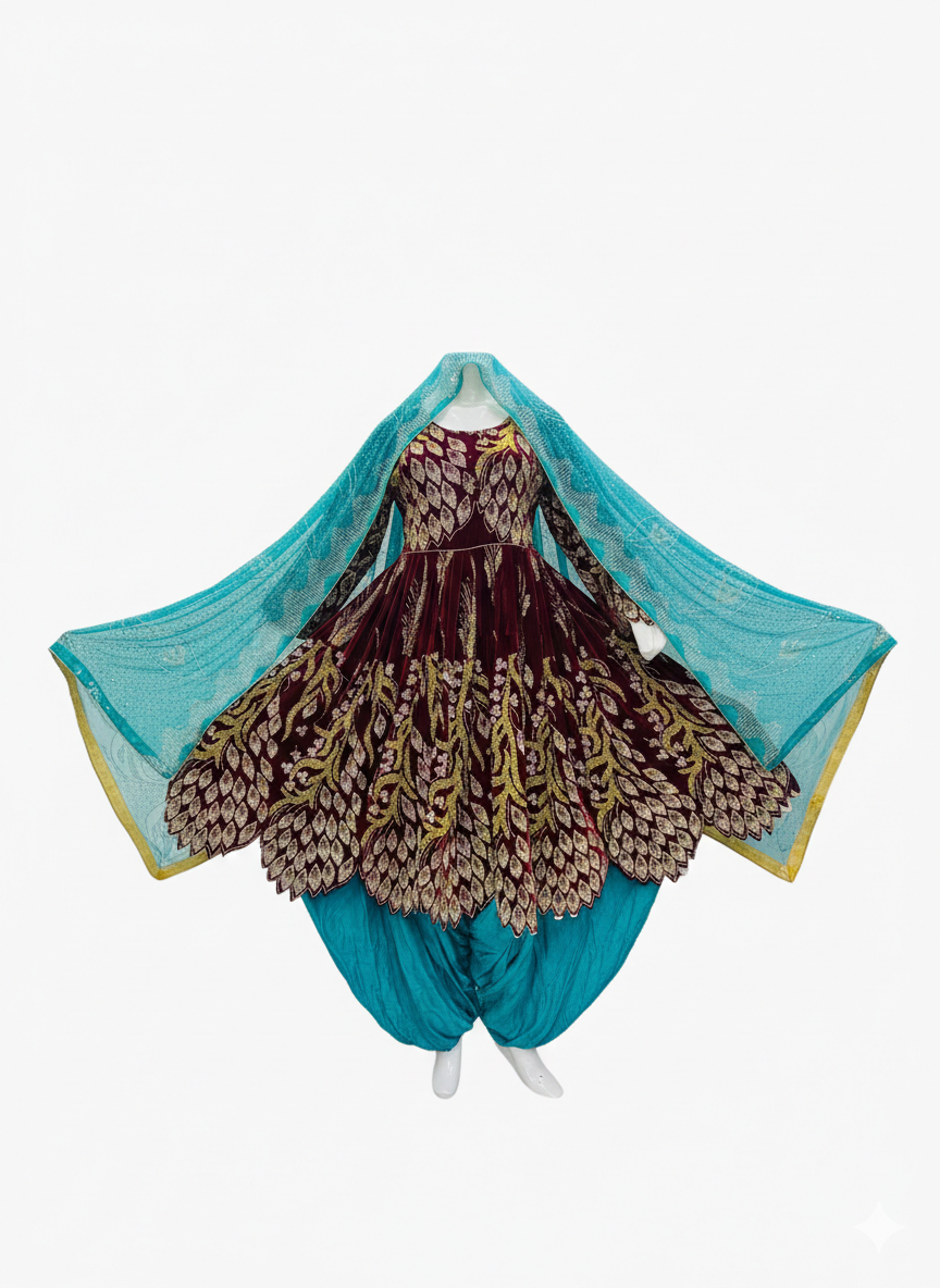 AfghaniDress Traditional Ethnic Outfit – Maroon & Teal with Gold Embellishment (Formal Wear)