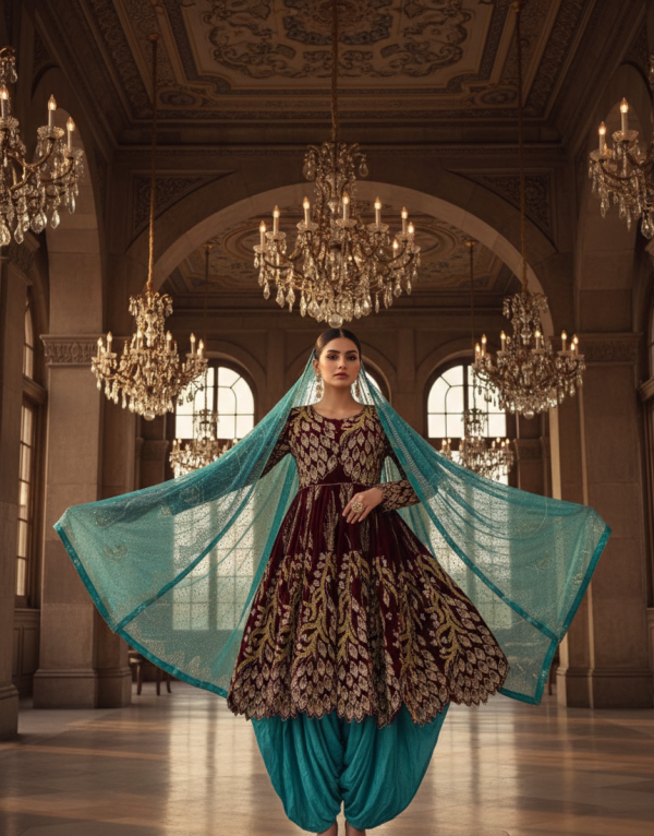 Presenting a timeless piece of cultural elegance, this AfghaniDress Traditional Ethnic Outfit is designed to reflect royal charm and refined craftsmanship. Featuring a rich maroon base beautifully balanced with teal accents and luxurious gold detailing, this dress delivers a bold yet graceful formal look.